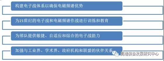 《電子戰(zhàn)戰(zhàn)略》指出,美國電子戰(zhàn)的發(fā)展愿景是通過敏捷、自適應(yīng)和綜合的電子戰(zhàn),在各種軍事行動(dòng)中進(jìn)攻性地奪取電磁頻譜優(yōu)勢(shì),發(fā)展目標(biāo)包括: